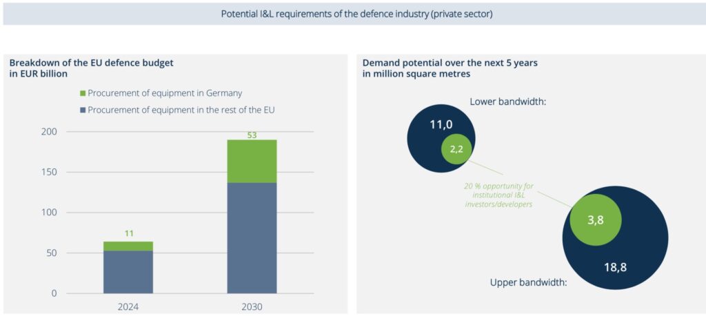 The demand potential of industrial & logistics space for the defence sector in the next five years is expected to be between 11 million sq m at the low end of the scale and a high estimate 18.8 million sq m, as all countries in the EU increase their budgets to strengthen their capabilities and self-sufficiency in the face of growing Russian aggression. For Germany alone the estimate is between 2.2 and 3.8 million sq m.