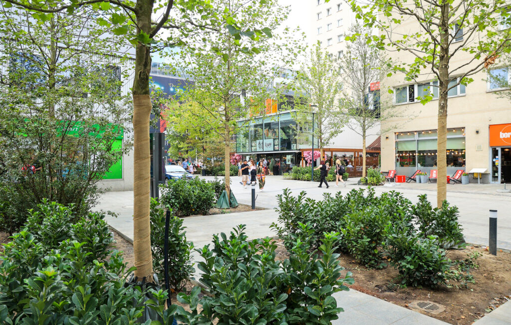 Key to the New Centre is an ambitious deconcretisation strategy that involves removing paved surfaces and replacing them with trees, shrubs, lawns and rain-resilient landscaping. The transformation of Central Square illustrates this approach vividly: once a car park, it has been reimagined with 102 trees, 550 shrubs and 81,000 perennials, irrigated by underground retention reservoirs designed to capture stormwater. A mass events zone and restored pre-war street layout tie history to modern utility.