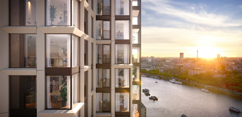 The building has four floors of amenities for residents, including a hydrotherapy and current pool, padel court, rock-climbing wall, screening room, podcasting studio, co-working spaces, and a private club with terrace on the 23rd floor overlooking the Thames.